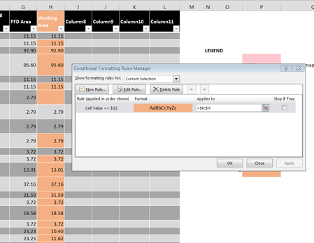 Initially you'd like to compare values in columns G and H row by row. With that rule you check if the value in next column is equal to the value in previous one, but only in row #1.