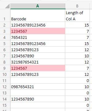 Greetings I scan four different barcodes into a single column, formatted as text, into a worksheet. The barcodes can have the following lengths: 7, 10, 12 & 15 characters long. I need to be able to...