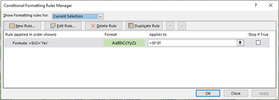 I am trying to format the cells in a row between columns F-T based on the result of "Yes" from column U containing the IF formula =IF(J2=M2,"Yes","No").
