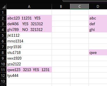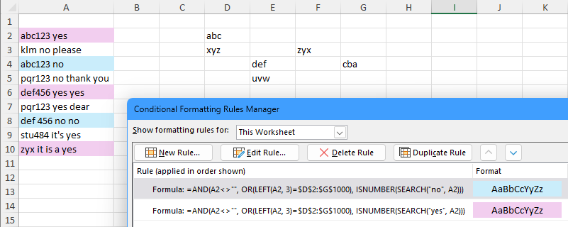 =AND(A2<>"", OR(LEFT(A2, 3)=$D$2:$D$1000), ISNUMBER(SEARCH("yes", A2)))