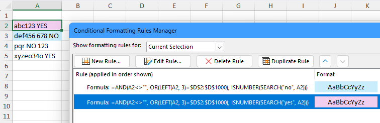 HansVogelaarthank you for the very quick response that was worked like a charm! I will mark it as a solution. Once I applied it to my excel sheet I noticed another twist I would like to add I hope you can give me a hand with that. I was to be able to be a certain color if the partial match also contains a yes or no. I will screenshot again what I mean,