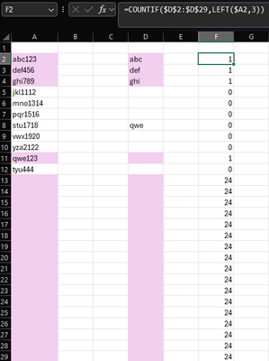 Create a conditional formatting rule with formula=AND(A2<>"", OR(LEFT(A2, 3)=$D$2:$D$1000))