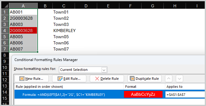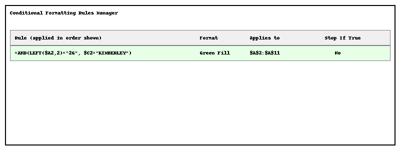 =AND(LEFT($A2,2)="2G", $C2="KIMBERLEY")Setup: