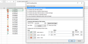 The 69.5 and 59.5 in the rule do not refer to the values in the cells, but they specify that the bottom 59.5% of the data will be red, the next 10% yellow, and the rest green.