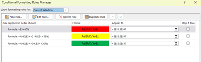 Need help on this. I applied a conditional formatting on column E based on the threshold level listed in Column I . But it seems to have worked but on row, the one listing the 20% didn't. Another row having the 20% did turn green but I am not sure the reason but this one does not turn green. Would you please me on this. Thank You