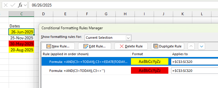 =AND(C3>=TODAY(),C3<=EDATE(TODAY(),3)) =AND(C3<TODAY(),C3<>"")