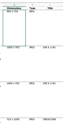 I've an excel contact sheet with thousands of images that contains a column with dimensions. The sheet is produced automatically by a plugin in Lightroom, and outputs dimensions for each image as "00...