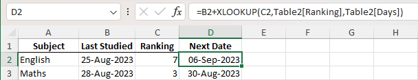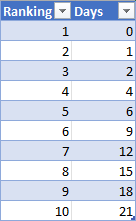 =B2+XLOOKUP(C2,Table2[Ranking],Table2[Days])