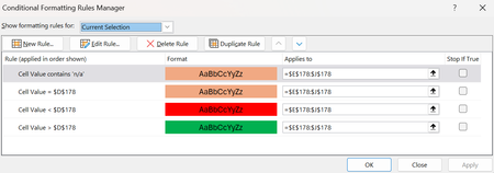 Hi, If anyone could help that would be great. I'm trying to make a rule on multiple lines where I need cells E-J formatted depending on conditions of cell D in the rule and to then apply th...