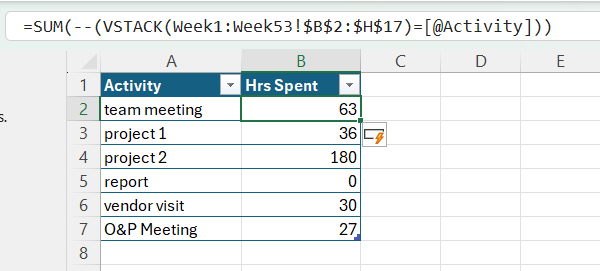 To be more specific, I want to measure how many hours I am spending on each activity as the year goes on. I have a sheet for every week. If a new activity appears, I'll add it to the table on the right before using it on the table to the left so that the match will be exact. Real table measure activities each "half hour", 8 hour a day.