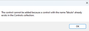 To resolve this issue, you'll need to remove or rename the existing control named "Tabula1". Here's how you can do it: