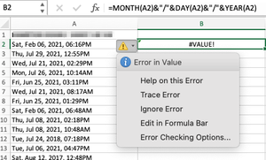 How can I convert the following cell of day, date, time to a simple date format? Current Cell: Sat, Feb 06, 2021, 06:16PM Goal Format: 2/6/2021 I tried the following formula, but it didn't wo...