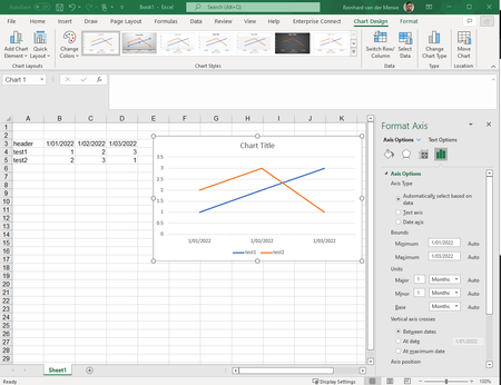 Drahnier When you convert a range of cells into a structured table whatever is in the header row becomes text. So, the dates are no longer numeric values that Excel can use in setting boundaries to the axis. If you want to work with dates in a structured table you must put them in a column.