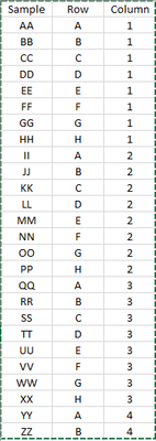 Hello, I am using a 96 well plate reader which outputs data as a list of samples that correlate to a row value and a column value. A simplified version of what it puts out looks like this: Wh...
