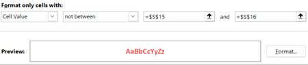 I have set up a condition that if the any of the values in W15 ~ AA15 is not between the parameters in S15 and S16, then the value turns RED.