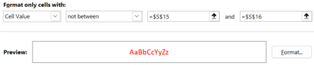 After setting this condition for the cells W15 ~ AA15, I then want to copy this condition to Cells W17 ~ AA17 but have the parameter values change to between S17 and S18.