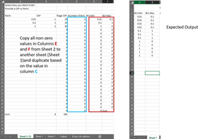 Hello All, I want to copy the values of 2 columns based on a value in a 3rd column. The values should be duplicated based on the value in the 3rd column. The input data and output data are in differ...