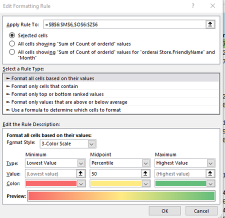 nancynancy I overlooked the fact that this is in a pivot table. At the top of the C.F. dialog (you posted a screen-shot), don't use the "Selected cells" choice, but select either of the two subsequent options: "All cells showing...". This will cause Excel to automatically expand and contract the conditional format range as your pivot table grows or shrinks.