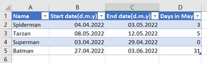=IFERROR(DATEDIF(MAX(DATE(2022,5,1),B2),MIN(DATE(2022,5,31),C2),"d")+1,0)Maybe with this formula.