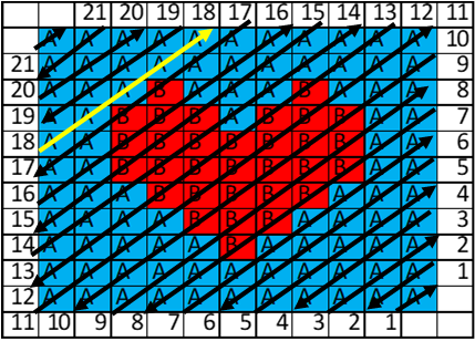 I didn't catch how it works exactly. Let take 17 - I guess we shall check cells B7,C6,D5,E4,F3,G2. It gives 2A2B2A, not 5A as in the sample.