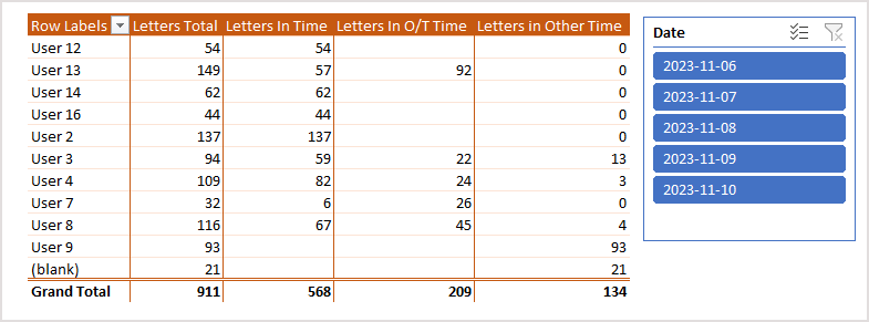 | 27/10/2023 | User 4 | 08:00:00 | 16:05:00 | 06:45:00 | 07:45:00 |