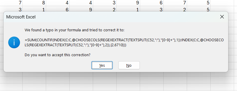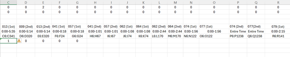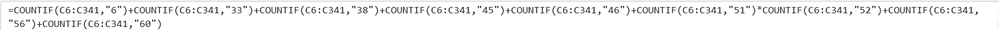 The above formula returns the expected result in Excel 365, Excel for the web and Excel 2024. We have to make sure that there isn't a circular reference. The formula is in cell C5 and dragged to the right in row 5. That's why we can only count the occurrences of {6.12.23.60} starting from row 6 in order to avoid a circular reference. This means that all ranges between C6:C1048576 are allowed. In your formula i see one occurrance of COUNTIF*COUNTIF but i assume you always want COUNTIF+COUNTIF.
