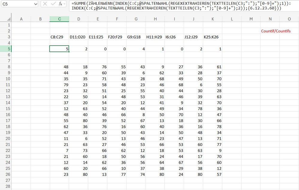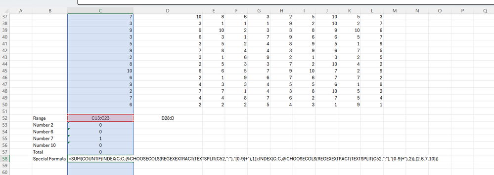 =SUM(COUNTIF(INDEX(C:C,@CHOOSECOLS(REGEXEXTRACT(TEXTSPLIT(C3,":"),"[0-9]+"),1)): INDEX(C:C,@CHOOSECOLS(REGEXEXTRACT(TEXTSPLIT(C3,":"),"[0-9]+"),2)),{6.12.23.60}))