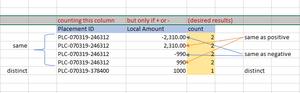 Hi, I am trying to create a count formula for the below scenario. I am trying to count duplicates in one column, but only count them if they are either negative or positive values in a second co...