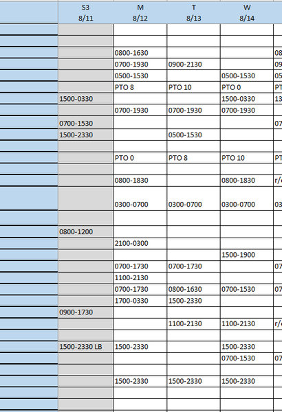 =LET( timeLine, EXPAND(TOCOL(dates + SEQUENCE(24, , 0) / 24, , TRUE), , 2, 0), validTimes, REGEXEXTRACT(times, "\d{4}-\d{4}"), assocDates, TOCOL(IF(ISERROR(validTimes), NA(), dates), 3, TRUE), clockTimes, TOCOL(validTimes, 3, TRUE), startTimes, MAP( TEXTBEFORE(clockTimes, "-"), LAMBDA(t, SUM({60, 1} * REGEXEXTRACT(t, "\d{2}", 1) / 60 / 24)) ), endTimes, MAP( TEXTAFTER(clockTimes, "-"), LAMBDA(t, SUM({60, 1} * REGEXEXTRACT(t, "\d{2}", 1) / 60 / 24)) ), finishTimes, endTimes + (startTimes > endTimes), startDatetimes, EXPAND(assocDates + startTimes, , 2, 1), finishDatetimes, EXPAND(assocDates + finishTimes, , 2, -1), keyDatetimes, VSTACK(timeLine, startDatetimes, finishDatetimes), events, SORT(keyDatetimes), sortedDatetimes, TAKE(events, , 1), headcount, SCAN(0, TAKE(events, , -1), SUM), timeslot, FLOOR.MATH(sortedDatetimes, 1 / 24), duration, DROP(sortedDatetimes, 1) - sortedDatetimes, manhours, headcount * duration, day, INT(timeslot), hour, MOD(timeslot, 1), DROP(PIVOTBY(hour, day, 24 * manhours, SUM, , 0, , 0), , -1) )There might be a case for modularising the formula further to separate the restructuring (using REGEX) from the subsequent calculation. The calculations for headcount and time durations could also be Lambda function. I feel I should use more in the way of functional breakdown of problems using a tree of Lambda functions than I do. The "1500-0330" is still a bit of an unresolved problem since it pushes 3½ hours labour outside the period of the analysis.