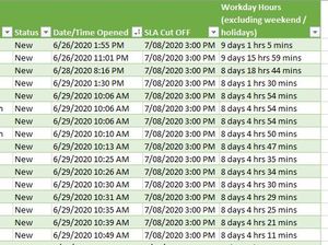 The only way that I am taking weekends and holidays into account is in column G which excludes those items - but I'm worried about the first part first. I may not need to worry about it, if I can get the formula to work between date/time ranges.