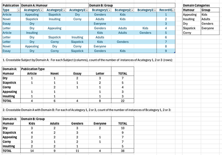 Hi, I am trying to figure out how to code for the resulting tables #1 and #2 in the screenshot, based on the data table. Each publication can be characterized by 1 to 3 categories of humour in domain...
