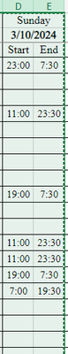 b) how are those start and end times entered? I assume they are not text but are they just time? So wouldn't 23:00 be after 7:00? or is the date included so 23:00 is really 3/9/2024 23:00?