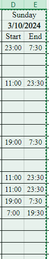 b) how are those start and end times entered? I assume they are not text but are they just time? So wouldn't 23:00 be after 7:00? or is the date included so 23:00 is really 3/9/2024 23:00? Start and end times are entered using just time, no date.