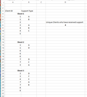 Hello. I'm trying to write a formula but am having no luck - help please. I would like to count all unique values (these are client id numbers) in column A across multiple sheets (only counting...