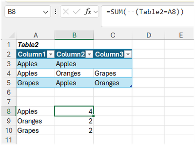 fruit = UNIQUE(TOCOL(Tabelle1,1)) count = COUNTIFS(Tabelle1, fruit)- Officeuser7777Copper Contributor