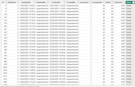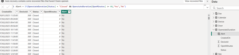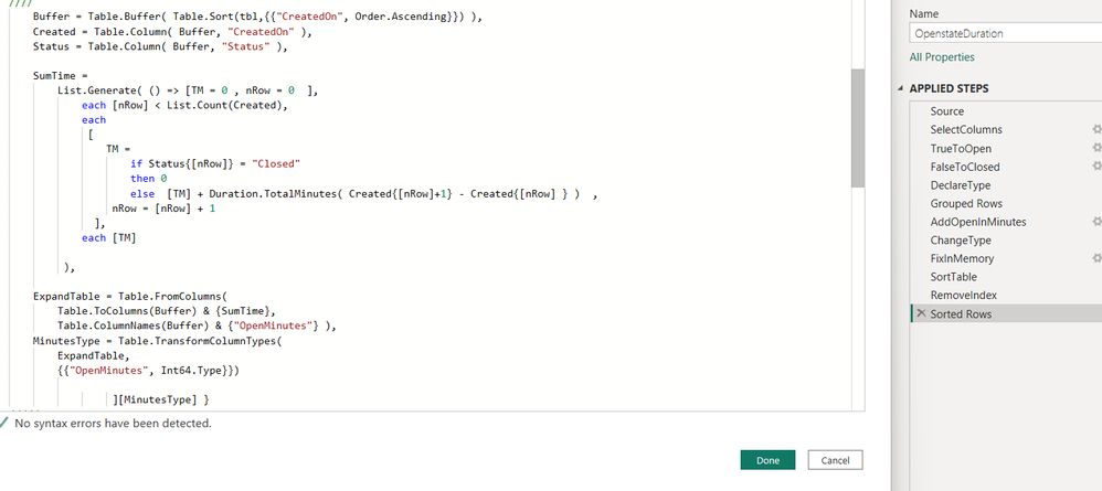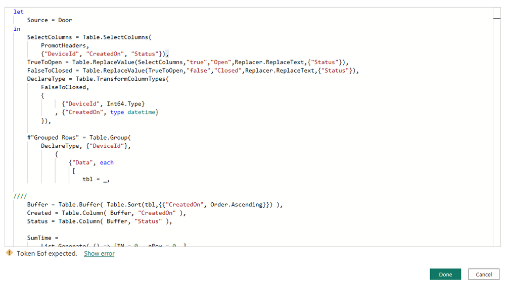 let Source = Csv.Document(File.Contents("C:\Test\Door.csv"),[Delimiter=",", Columns=12, Encoding=1252, QuoteStyle=QuoteStyle.None]), PromotHeaders = Table.PromoteHeaders(Source, [PromoteAllScalars=true]), SelectColumns = Table.SelectColumns( PromotHeaders, {"DeviceId", "CreatedOn", "Status"}), TrueToOpen = Table.ReplaceValue(SelectColumns,"true","Open",Replacer.ReplaceText,{"Status"}), FalseToClosed = Table.ReplaceValue(TrueToOpen,"false","Closed",Replacer.ReplaceText,{"Status"}), DeclareType = Table.TransformColumnTypes( FalseToClosed, { {"DeviceId", Int64.Type} , {"CreatedOn", type datetime} }), #"Grouped Rows" = Table.Group( DeclareType, {"DeviceId"}, { {"Data", each [ tbl = _, //// Buffer = Table.Buffer( Table.Sort(tbl,{{"CreatedOn", Order.Ascending}}) ), Created = Table.Column( Buffer, "CreatedOn" ), Status = Table.Column( Buffer, "Status" ), SumTime = List.Generate( () => [TM = 0 , nRow = 0 ], each [nRow] < List.Count(Created), each [ TM = if Status{[nRow]} = "Closed" then 0 else [TM] + Duration.TotalMinutes( Created{[nRow]+1} - Created{[nRow] } ) , nRow = [nRow] + 1 ], each [TM] ), ExpandTable = Table.FromColumns( Table.ToColumns(Buffer) & {SumTime}, Table.ColumnNames(Buffer) & {"OpenMinutes"} ), MinutesType = Table.TransformColumnTypes( ExpandTable, {{"OpenMinutes", Int64.Type}}) ][MinutesType] } ///// }), AddOpenInMinutes = Table.ExpandTableColumn( #"Grouped Rows", "Data", {"CreatedOn", "Status", "OpenMinutes"}, {"CreatedOn", "Status", "OpenMinutes"}), ChangeType = Table.TransformColumnTypes( AddOpenInMinutes, { {"CreatedOn", type datetime} , {"Status", type text} , {"OpenMinutes", Int64.Type} }), FixInMemory = Table.AddIndexColumn(ChangeType, "Index", 0, 1, Int64.Type), SortTable = Table.Sort( FixInMemory, { {"DeviceId", Order.Ascending} , {"CreatedOn", Order.Ascending} }), RemoveIndex = Table.RemoveColumns(SortTable,{"Index"}) in RemoveIndex- source is exported from your model to csv (attached)