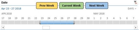 Option Explicit Public glblDate As Date Sub Timeline_curr() Dim CurrentWeekDateOffset As Date: Dim Csd As Date: Dim Ced As Date Dim PreviousWeekDateOffset As Date: Dim Psd As Date: Dim Ped As Date Dim NextWeekDateOffset As Date: Dim Nsd As Date: Dim Ned As Date Select Case Application.Caller Case "shpCurrent": glblDate = Date CurrentWeekDateOffset = Date Csd = CurrentWeekDateOffset - Weekday(CurrentWeekDateOffset, 2) + 1 Ced = CurrentWeekDateOffset - Weekday(CurrentWeekDateOffset) + 6 ActiveWorkbook.SlicerCaches("NativeTimeline_Date").TimelineState.SetFilterDateRange Csd, Ced Case "shpPrevious": If IsNull(glblDate) Then PreviousWeekDateOffset = Date - 7 Else PreviousWeekDateOffset = glblDate - 7 glblDate = PreviousWeekDateOffset End If Psd = PreviousWeekDateOffset - Weekday(PreviousWeekDateOffset, 2) + 1 Ped = PreviousWeekDateOffset - Weekday(PreviousWeekDateOffset) + 6 ActiveWorkbook.SlicerCaches("NativeTimeline_Date").TimelineState.SetFilterDateRange Psd, Ped Case "shpNext": If IsNull(glblDate) Then NextWeekDateOffset = Date - 7 Else NextWeekDateOffset = glblDate + 7 glblDate = NextWeekDateOffset End If Nsd = NextWeekDateOffset - Weekday(NextWeekDateOffset, 2) + 1 Ned = NextWeekDateOffset - Weekday(NextWeekDateOffset) + 6 ActiveWorkbook.SlicerCaches("NativeTimeline_Date").TimelineState.SetFilterDateRange Nsd, Ned End Select End Sub- Anwesh GangulaApr 30, 2018Iron ContributorThis works the same way, it just scrolls through the latest 3 weeks. For example, it goes to prev week(2018.04.23) when I press "Prev Week" once. But it doesn't do anything when I click "Prev Week" again.