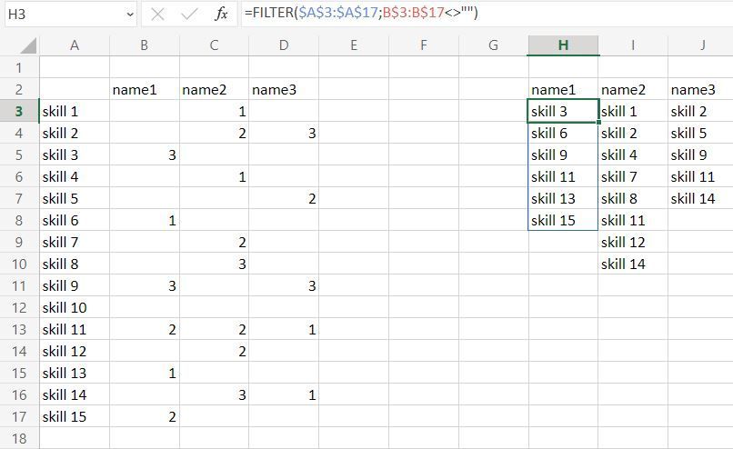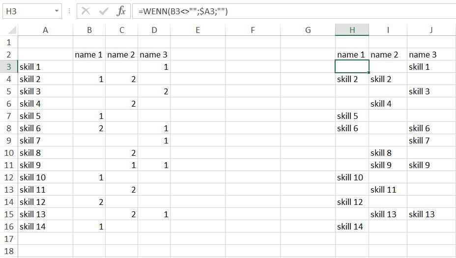 I want to output a list in column H where just the skills from column a are displayed, the person from B to D has a number assigned.