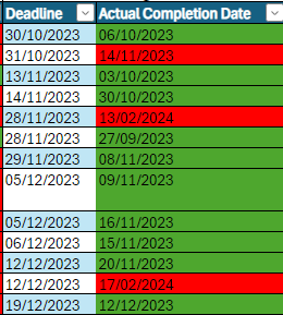 I have a series of data in a table, example below: It is formatted so that if the completion date is more than 3 months before the deadline, it highlights green, and less than 3 months high...