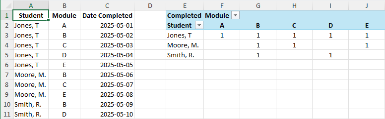 At its simplest, a pivot table with student in the Rows area, module in the Columns area and date of completion in the Values area:
