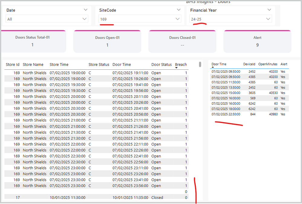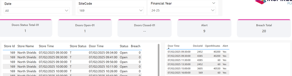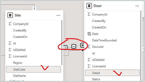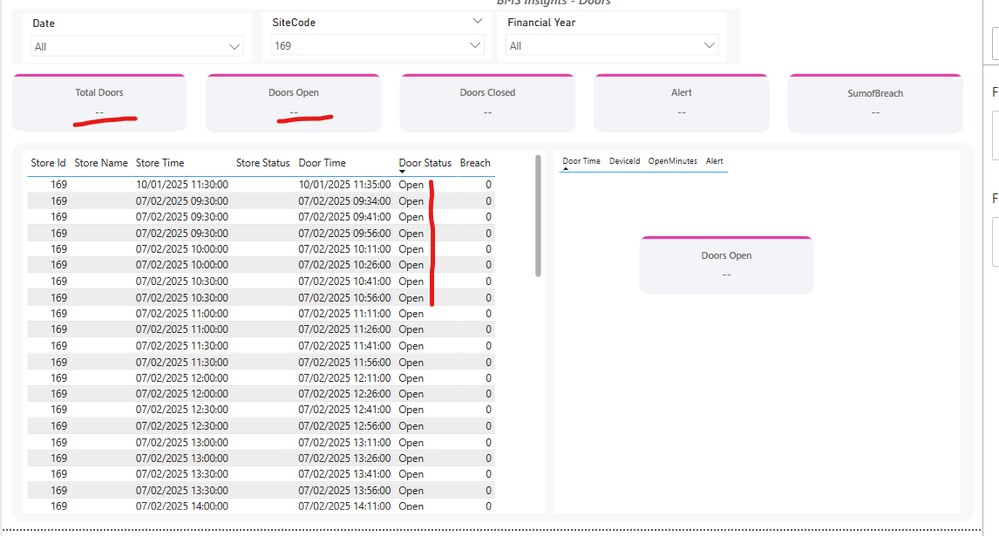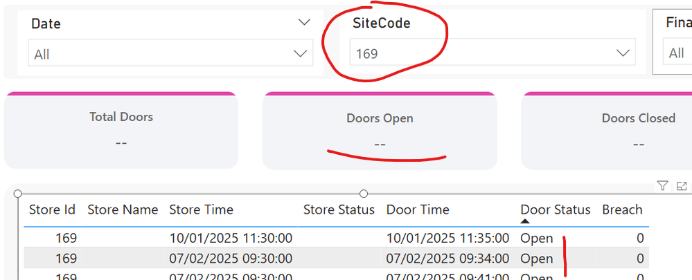 Doors Status Total-01 = VAR _count = MAX( Door[CreatedOn] ) RETURN CALCULATE( COUNTROWS(Door), Door[CreatedOn] = _count, USERELATIONSHIP( Door[SiteId], Site[SiteCode] ) ) ////////// Doors Open-01 = VAR _count = CALCULATE( MAX( Door[CreatedOn] ), Door[Status] = "Open" ) RETURN CALCULATE( COUNT( Door[CreatedOn] ), Door[CreatedOn] = _count, Door[Status] = "Open", USERELATIONSHIP( Door[SiteId], Site[SiteCode] ) ) ////////// Doors Closed-01 = VAR _count = CALCULATE( MAX( Door[CreatedOn] ), Door[Status] = "Closed" ) RETURN CALCULATE( COUNT( Door[CreatedOn] ), Door[CreatedOn] = _count, Door[Status] = "Closed", USERELATIONSHIP( Door[SiteId], Site[SiteCode] ) )With that it looks like
