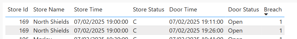 _Breach = VAR Statuses = MAX ( Door[Status] ) & [_Status] VAR Breach = IF ( ISBLANK ( [_Status] ), BLANK (), IF ( Statuses = "OpenC", 1, 0 ) ) RETURN IF ( HASONEVALUE ( Door[SiteId] ), Breach, BLANK () )To calculate total just iterate it on all doors