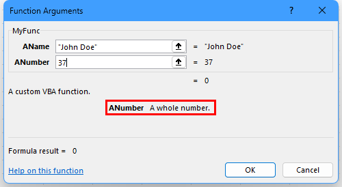 Function MyFunc(AName As String, ANumber As Long) As Variant ... ' your code goes here End FunctionIn a cell, type =MyFunc
