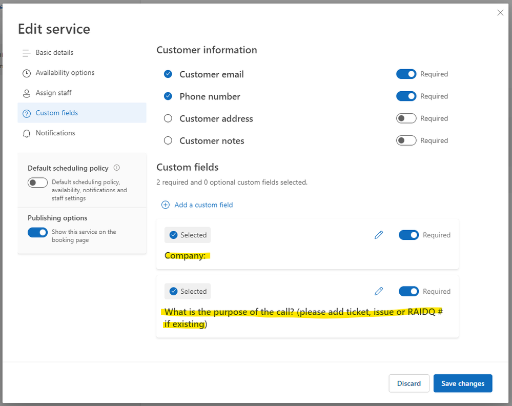 In Microsoft Bookings, navigate to the Services section. Select the service for which you want to display custom fields in the calendar invite. Check the settings related to calendar invites and ensure that the option for including additional information is enabled.