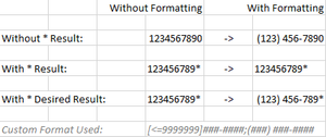 Hi all, Is there a custom number format that can be used to allow wildcards or asterisks (*) in a phone number? Below is an example of the desired result. The numbers on the left are not formatte...