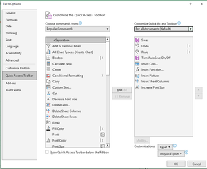 Hello! Whenever I add/remove the quick access toolbar in Excel, either "for all documents (default)" or "for book1" and then select ok, it does not save. I also tried exporting, then importing, i...