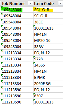 I am trying to pull data from one sheet to another. I have tried VLOOKUP to no avail. Here is what I am working with. Using the green as a reference, I want the yellow to populate into the red in another sheet when it correlates to the data in green. So, basically, search the green and if it matches the blue, dump the yellow into the red. I have separate sheets with data that I need to combine using the Job Number (green) as the reference so that I can compare the Item Code with the Duration.