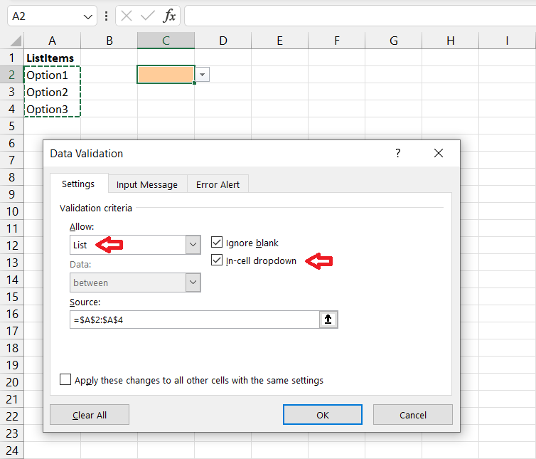 In your reply you do not include ListItems! as part of the Source code. This is not how the process is described in web page https://support.microsoft.com/en-au/office/create-a-drop-down-list-7693307a-59ef-400a-b769-c5402dce407b