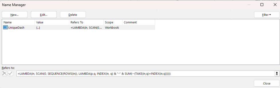 =LAMBDA(in, SCAN(0, SEQUENCE(ROWS(in)), LAMBDA(p,q, INDEX(in, q) & "-" & SUM(--(TAKE(in,q)=INDEX(in,q))))))then you just need to call UniqueDash with the range like