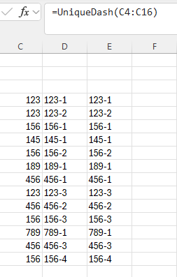 =UniqueDash(C4:C16)cell D4 used the first formula and E4 used the NAME function